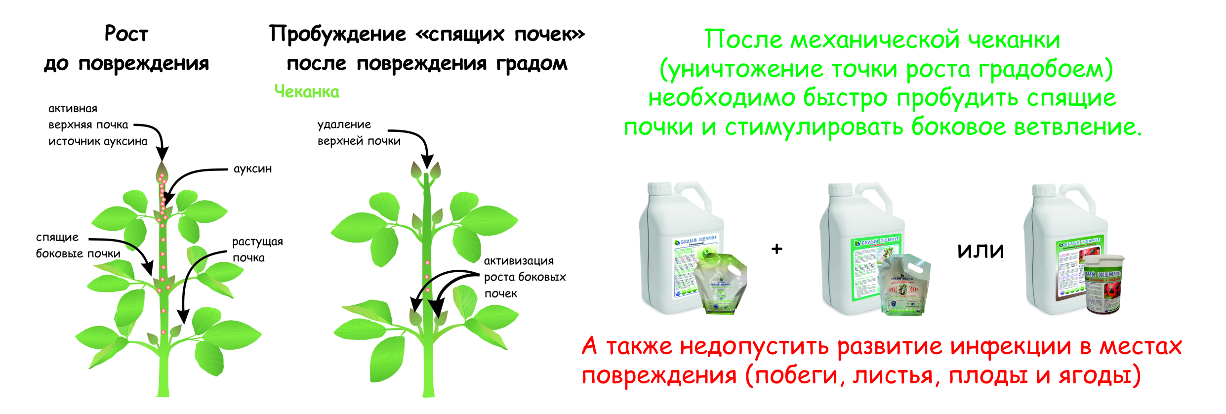 2. Стимулировать боковое ветвление и рост новых побегов после повреждения точки роста (эффект чеканки), чтобы нарастить биомассу за счет богатого комплекса природных фитостимуляторов в составе продуктов.