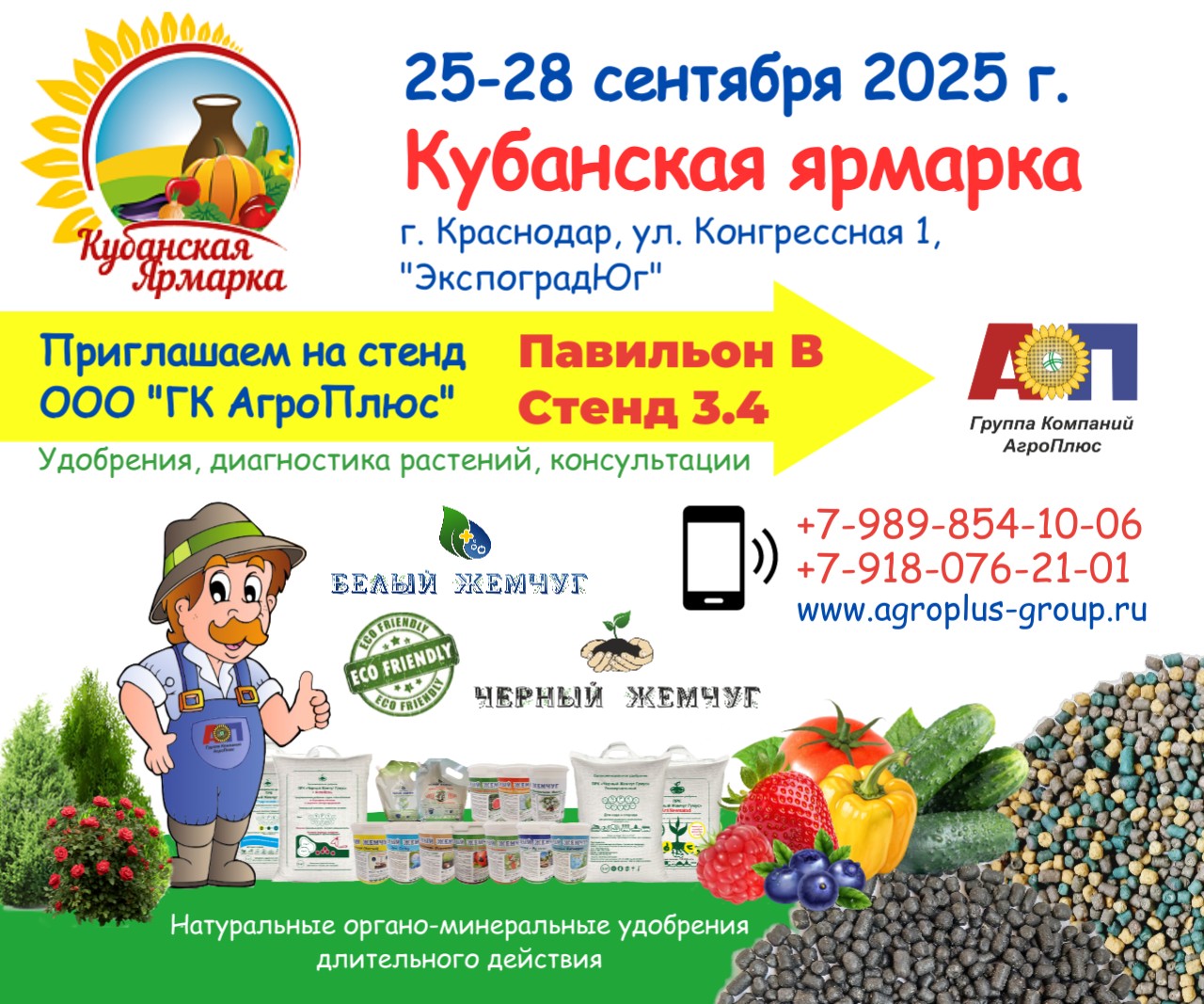 • С 25 по 28 сентября мы ждем вас в Краснодаре на «Кубанской ярмарке»:г. Краснодар, ул. Конгрессная, 1, «ЭкспоГрадЮг», стенд 3.4. павильон В. Здесь мы представим наши органо-минеральные удобрения и технологии, которые помогут сделать ваш сад и огород более урожайным.