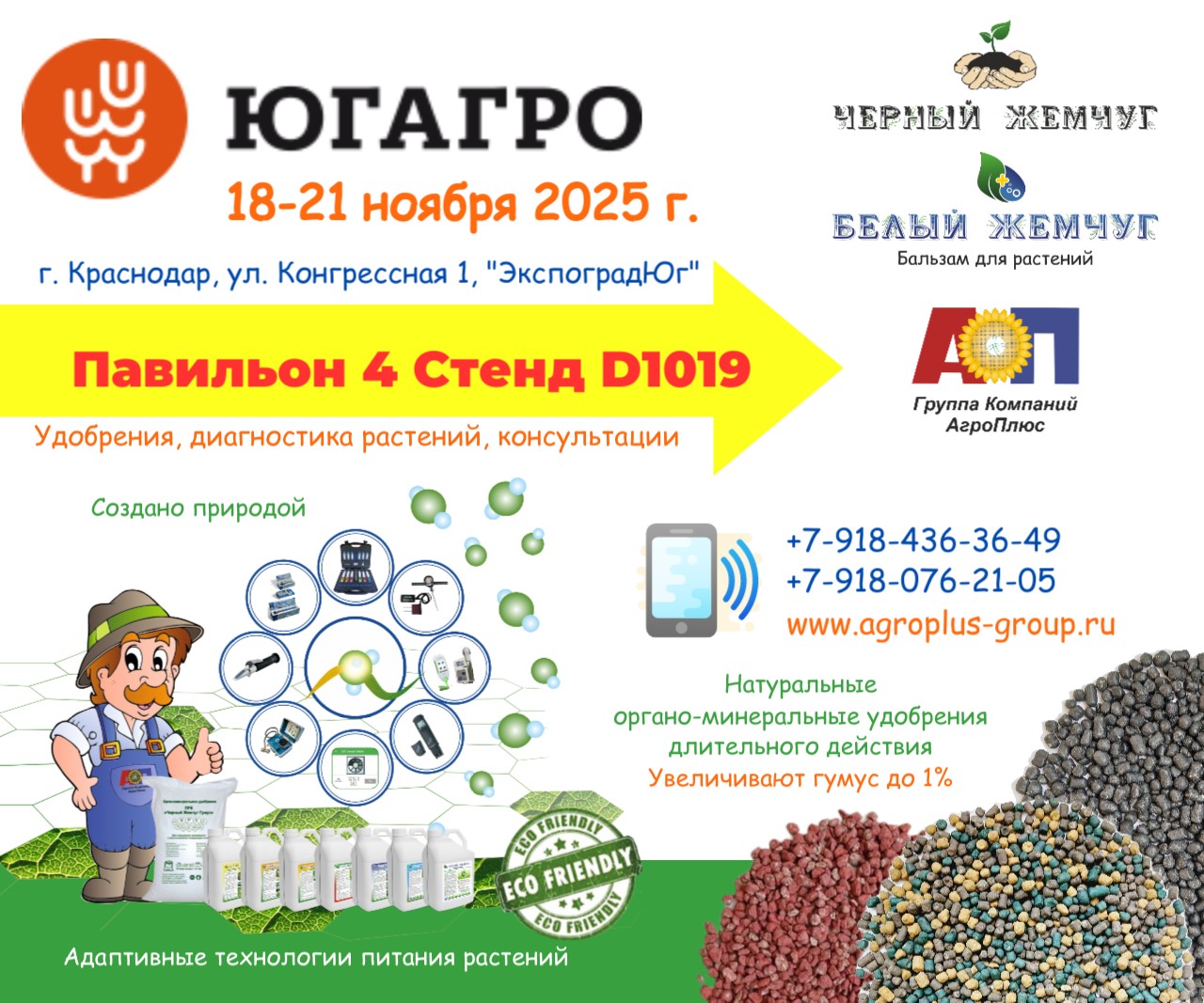 • С 18 по 21 ноября обязательно встретимся на международной сельскохозяйственной выставке «ЮгАгро»в Краснодаре, павильон 4, стенд D Вы сможете получить консультации наших специалистов по всем интересующим вопросам — технологиям питания сельхозкультур, решению проблем при выращивании, достижению определенных показателей по урожайности, качеству, срокам созревания, защите от болезней, заморозков, солнечных ожогов и др.