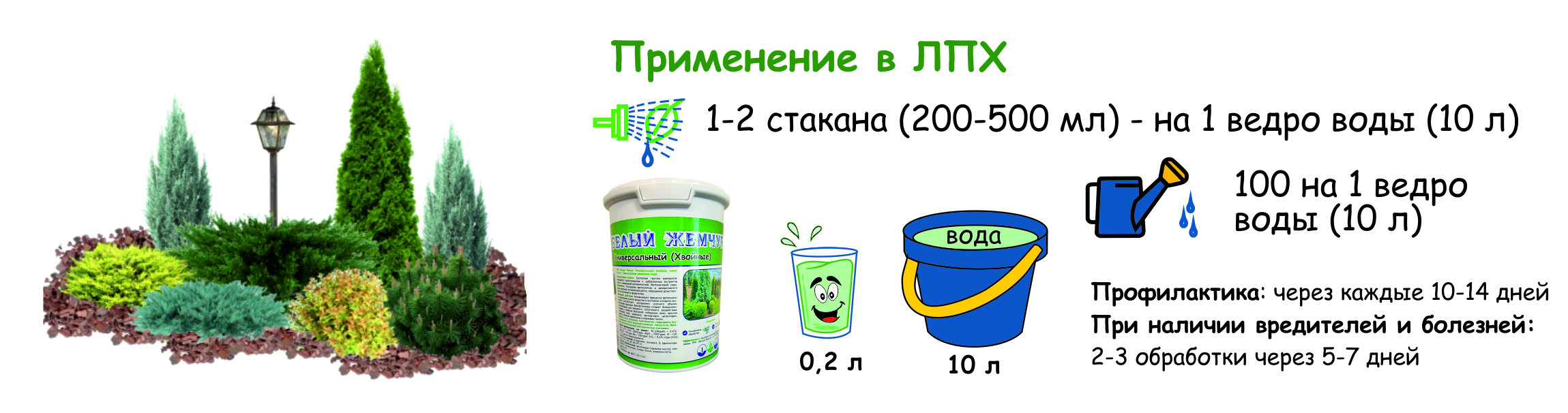 1) Некорневые обработки 2-5%-ным р-ром (200-500 мл на 10 л воды) в течение вегетационного периода через 10-14 дней, при наличии вредителей или болезней — 2-3 обработки через 5-7 дней — 500 мл на 10 л воды.