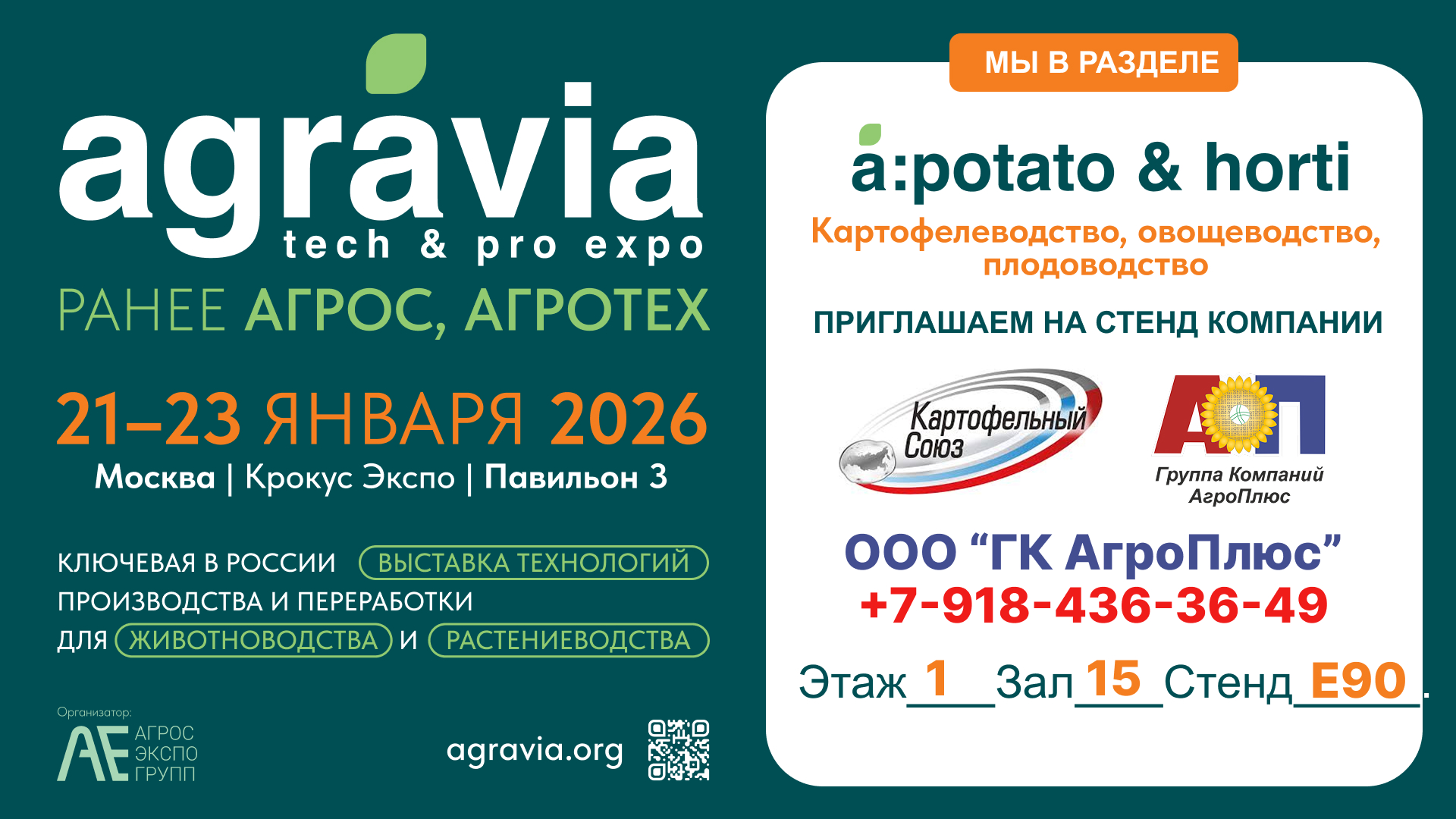 С 21 по 23 января Вы сможете встретиться со специалистами ООО «ГК АгроПлюс» на коллективном стенде Картофельного союза в Москве — КрокусЭкспо, Павильон 3, стенд   Е 90, зал 15, этаж 1. Подробности по тел.: +7-918-436-36-49.