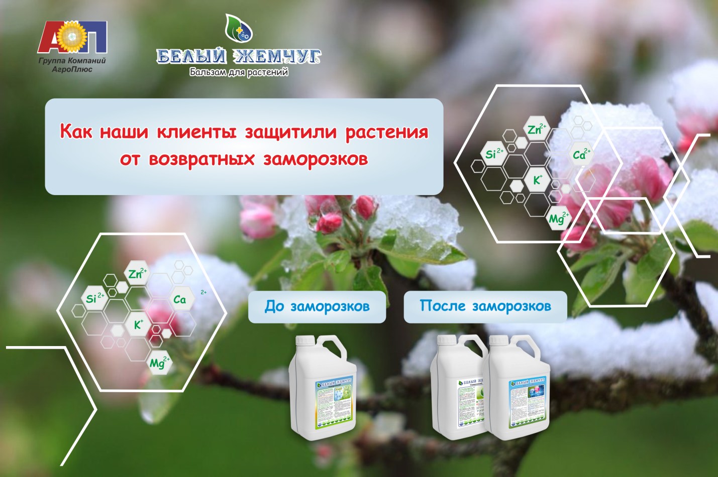 🔹 На плодовых культурах в Московской области: Применение «Белого Жемчуга» заблаговременно, до наступления заморозков, за счет накопительного защитного эффекта способствовало сохранению цветков яблони, груши, крыжовника от заморозков до -2…-4ºС и снега во время бутонизации и цветения. Плоды сформировались и не осыпались, когда заморозки сменились теплой погодой. Некорневые обработки в теплице перед заморозками позволили защитить также и растения огурца от повреждений.